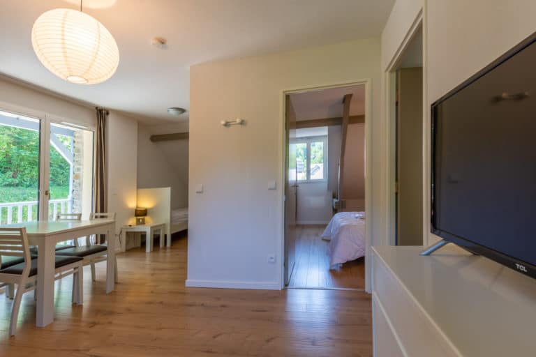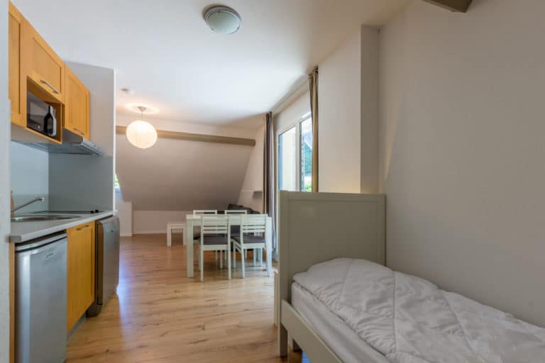Este piso de dos habitaciones tiene un dormitorio, una amplia sala de estar con cocina y un baño con aseo. Ideal si quieres tener más espacio y una cama extra con el encanto de un piso bajo techo.