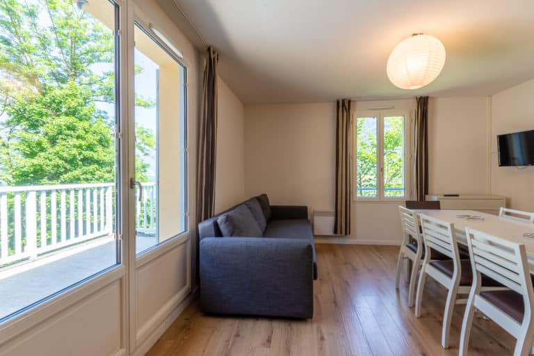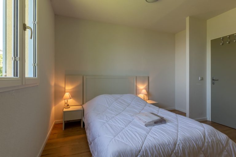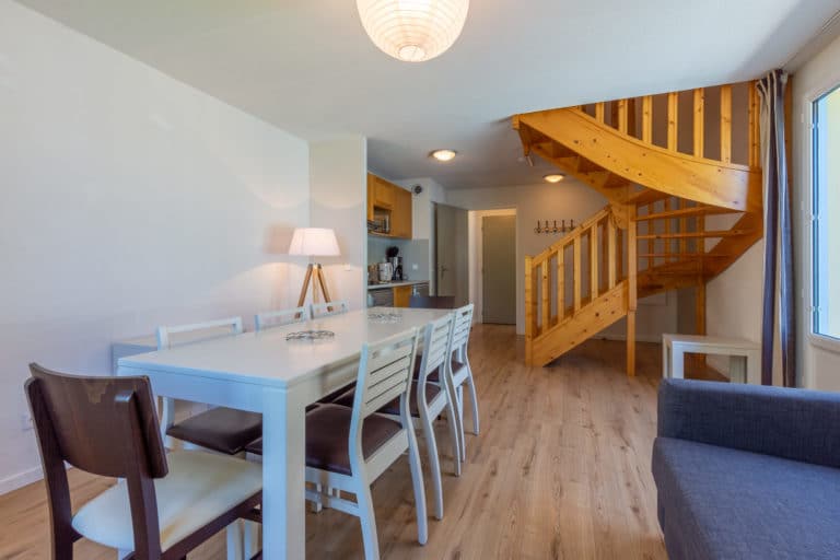 Les différences avec l’appartement T4 duplex : une entrée individuelle à l’extérieur, indépendante des autres bâtiments et une grande terrasse ainsi que les couchages (une chambre double et deux chambres « cabines » avec lits superposés).